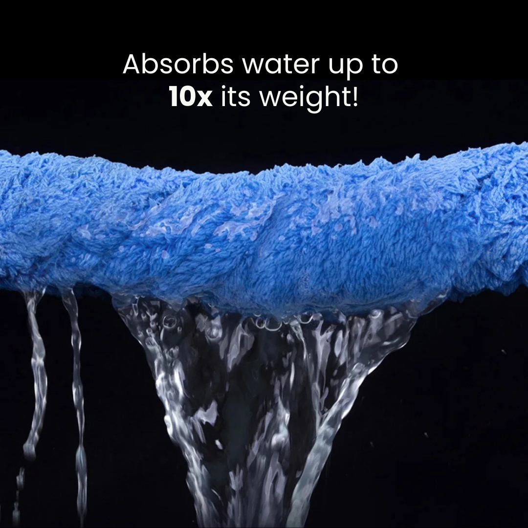 Absora towels are made from premium long-fibre microfiber with a 70:30 blend. They absorb up to 10× their weight in water, dry faster, and are completely lint-free and scratch-safe.